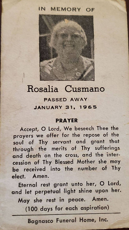 Rosalia (Rose) born in 1885- She married a cousin (Paul Cusmano) and had eight children Anna, Lena, Phillip, John, Frances, Mary, Joseph and Loretta - the last two died young